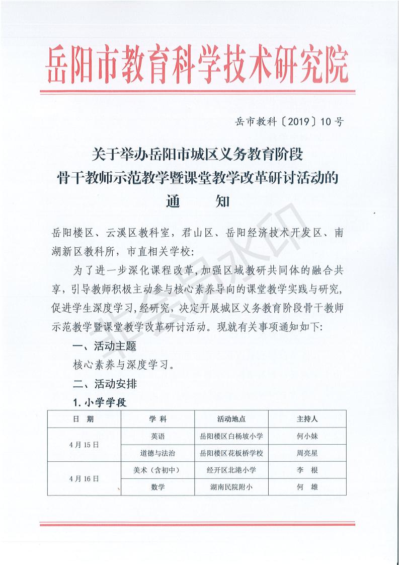关于举办岳阳市城区义务教育阶段骨干教师示范教学暨课堂教学改革研讨活动的通知(岳市教科〔2019〕10号)