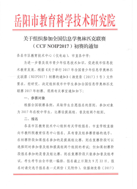 为进一步普及我市青少年信息技术知识,促进我市信息技术教育发展,根据《关于举行2017年全国青少年信息学奥林匹克联赛(NOIP2017)初赛的通知》(湘竞委〔2017〕5号)文件要求,经研究,决定组织我市中学生参加全国信息学奥林匹克联赛2017年初赛。现将有关事宜通知如下:
