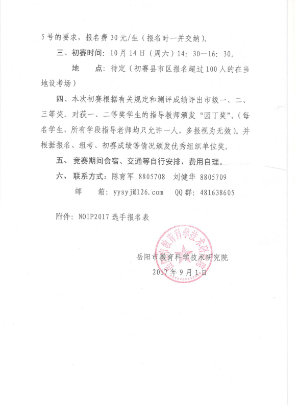 关于组织参加全国信息学奥林匹克联赛(CCF NOIP2017)初赛的通知((含扫描20170831).doc