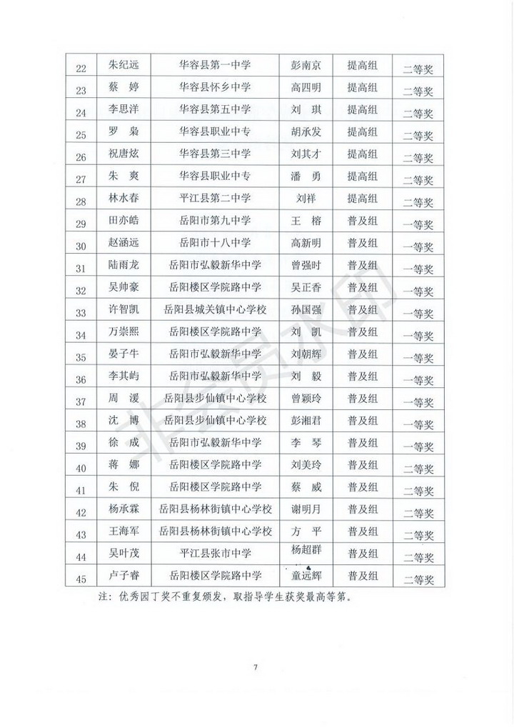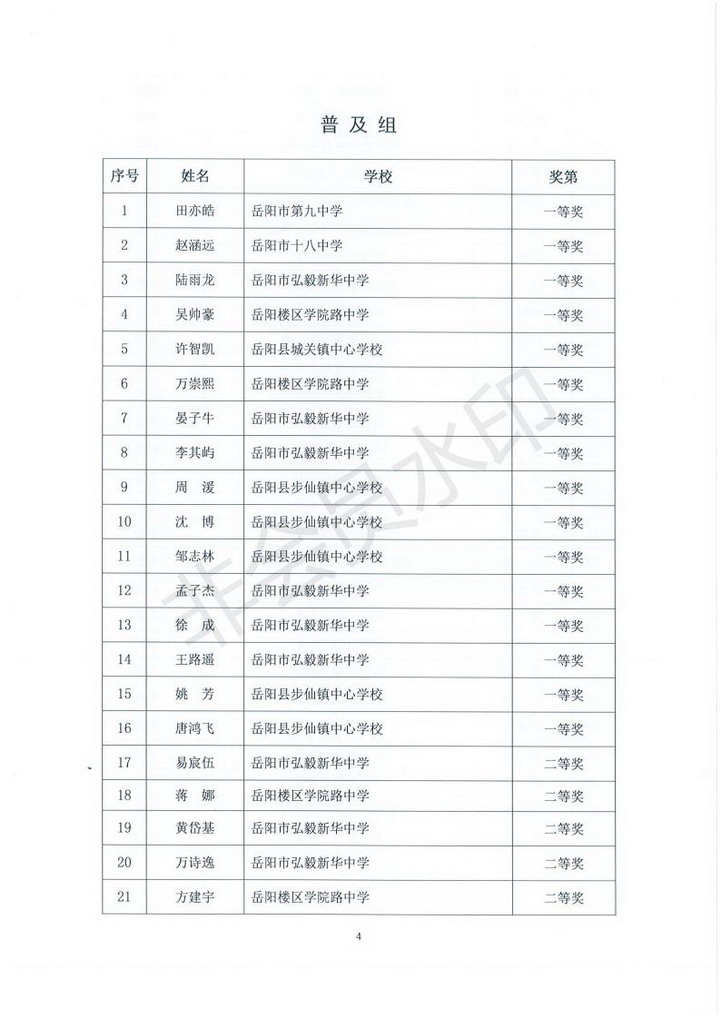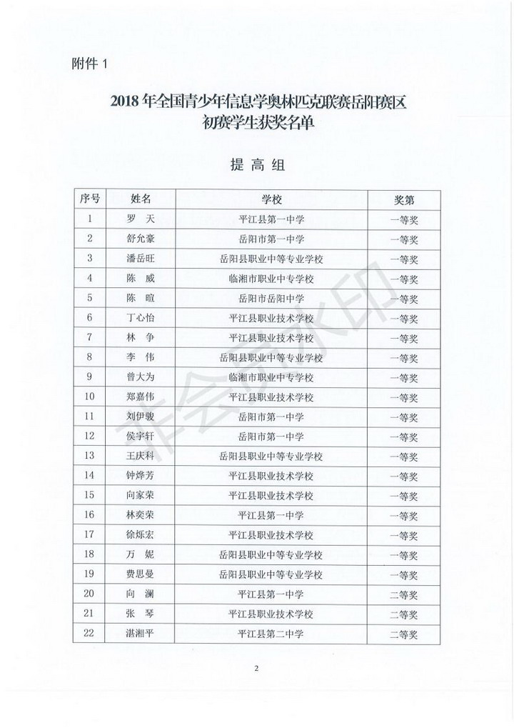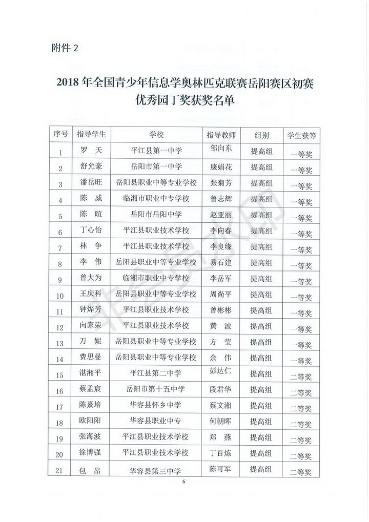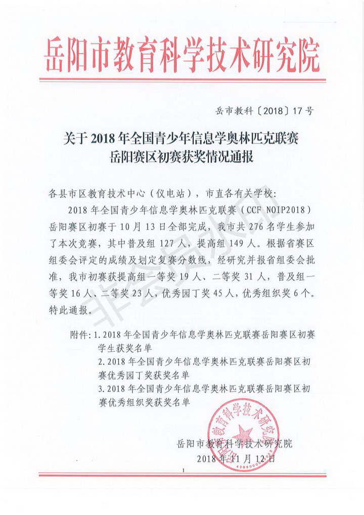 关于2018年全国青少年信息学奥林匹克联赛岳阳赛区初赛获奖情况通报(岳市教科〔2018〕17号)