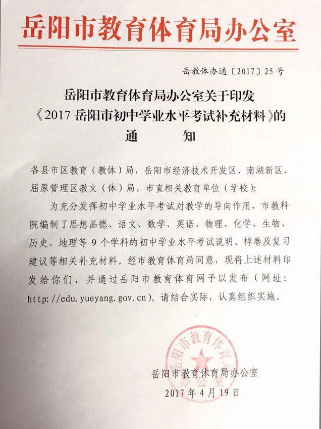 (岳教体办通〔2017〕25号)关于印发《2017岳阳市初中学业水平考试补充材料》的通知