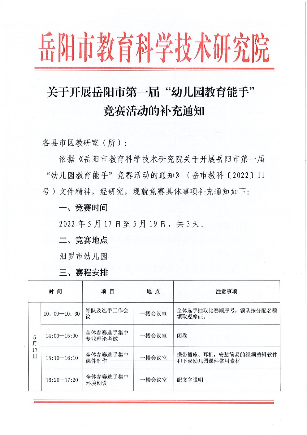 关于开展岳阳市第一届“幼儿园教育能手”竞赛活动的补充通知
