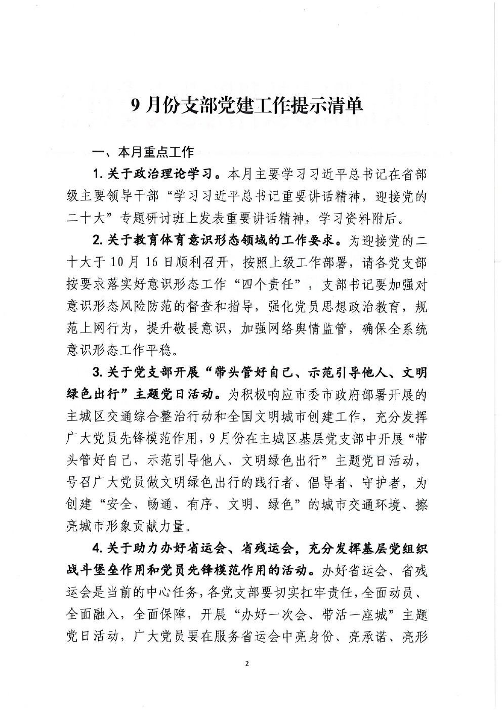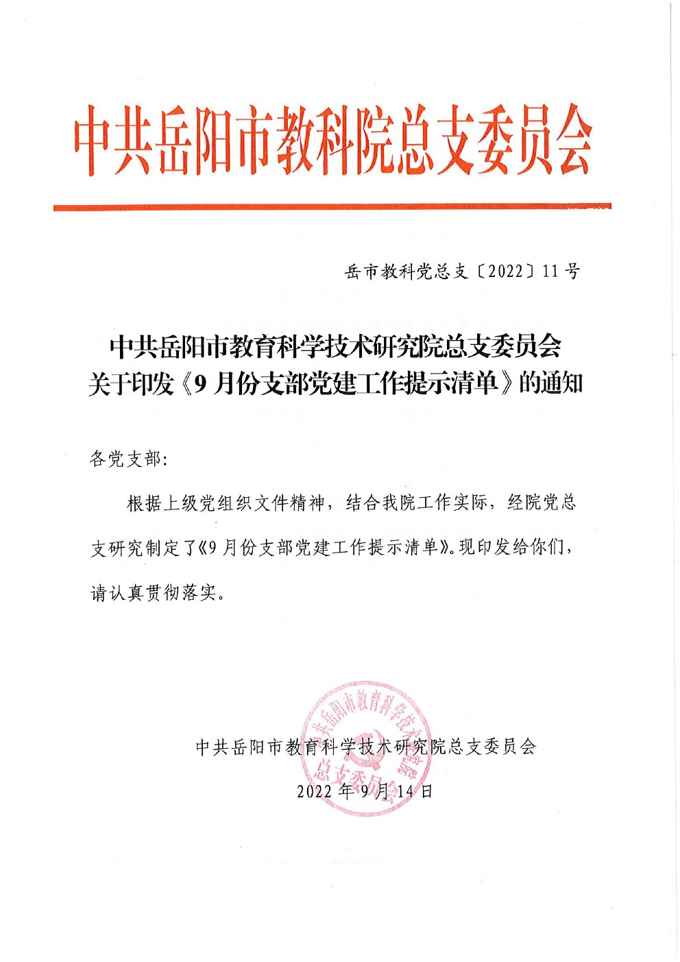 关于印发《9月份支部党建工作提示清单》的通知(岳市教科党总支〔2022〕11号)