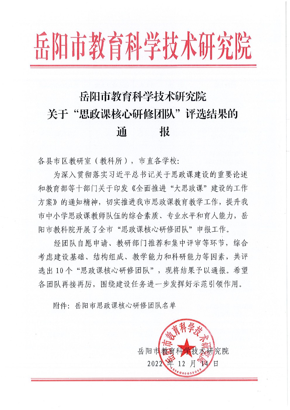关于“思政课核心研修团队”评选结果的通报