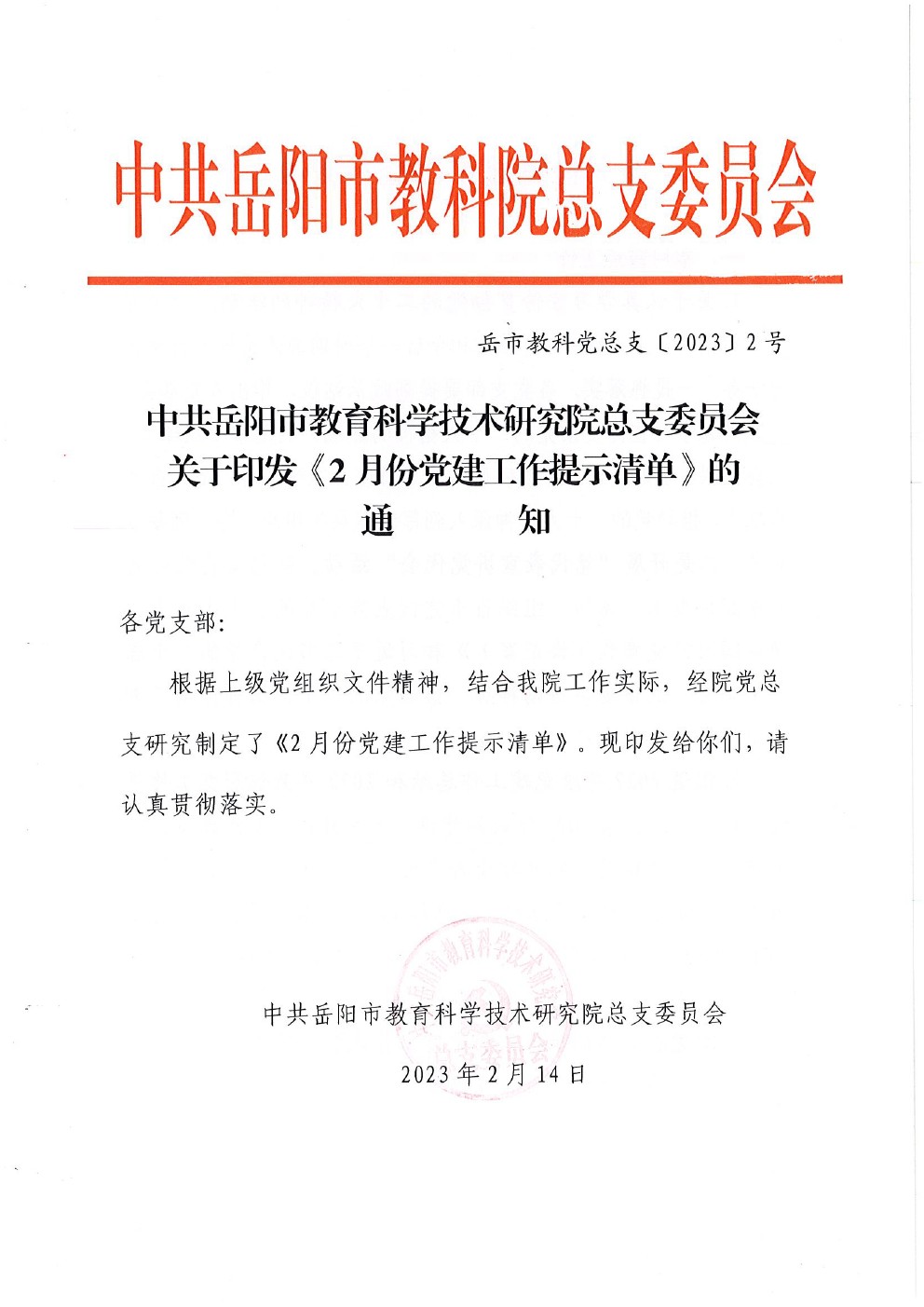 关于印发《2023年2月份支部党建工作提示清单》的通知(岳市教科党总支〔2023〕2号)