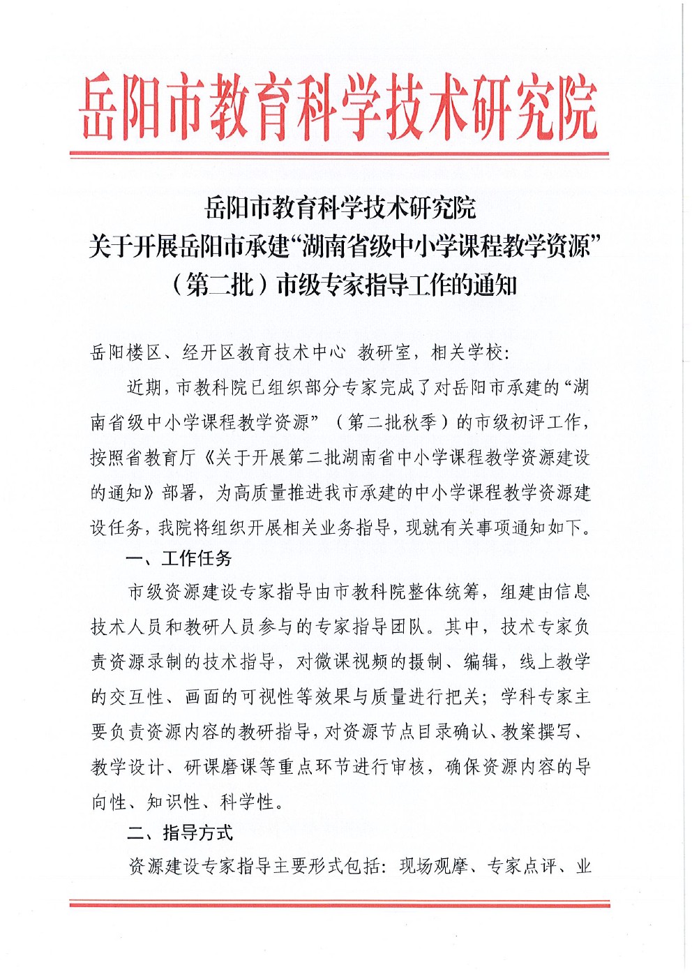 关于开展岳阳市承建“湖南省级中小学课程教学资源”(第二批)市级专家指导工作的通知