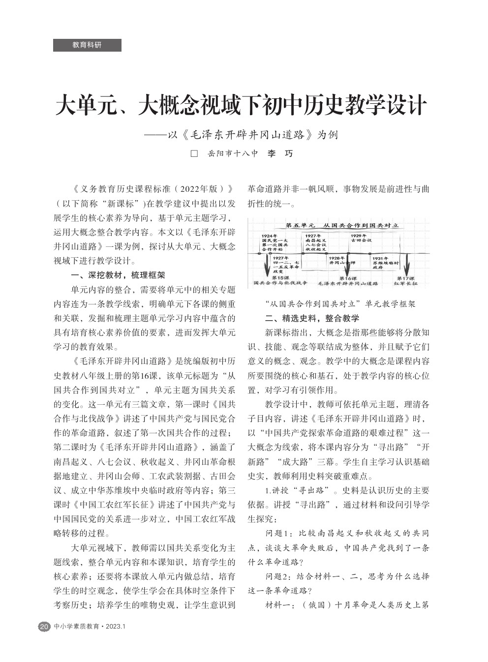 【2023年第1期】大单元 大概念视域下初中历史教学设计——以《毛泽东开辟井冈山道路》为例