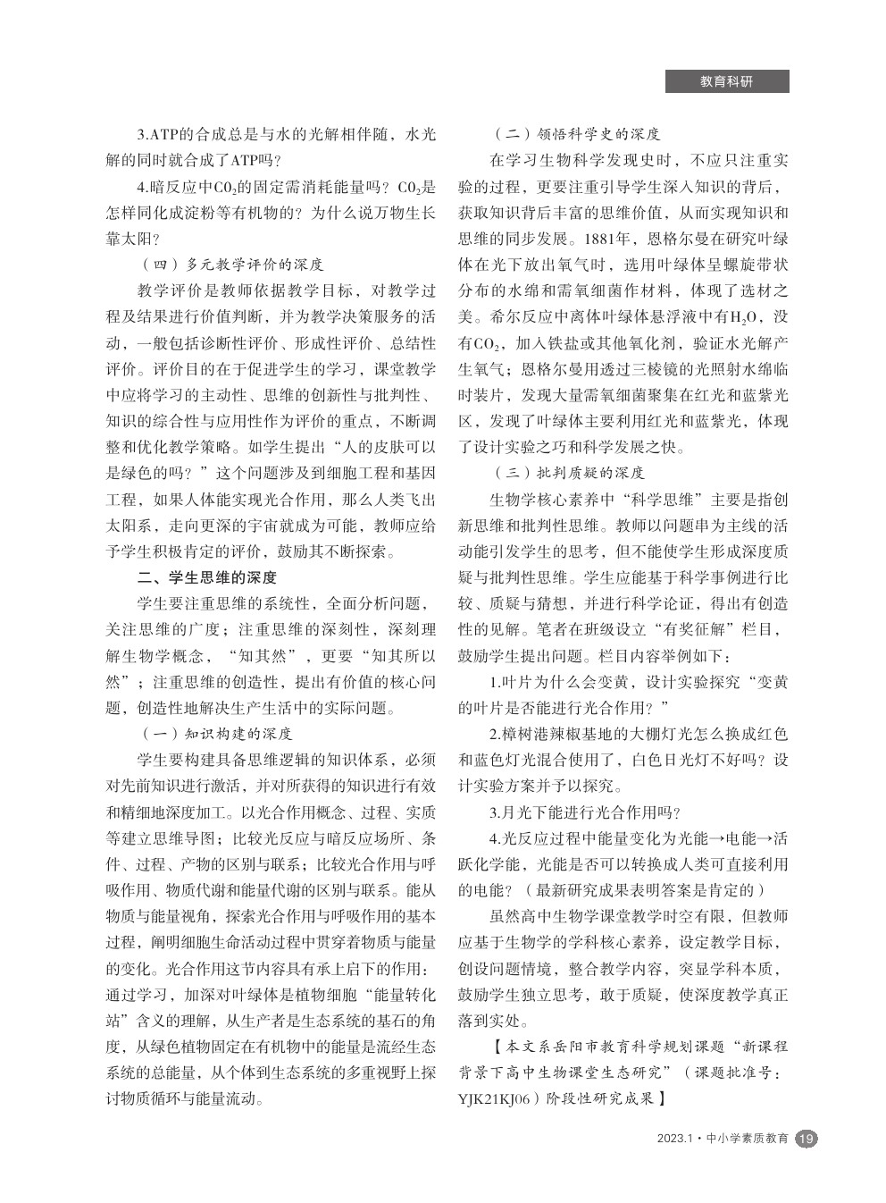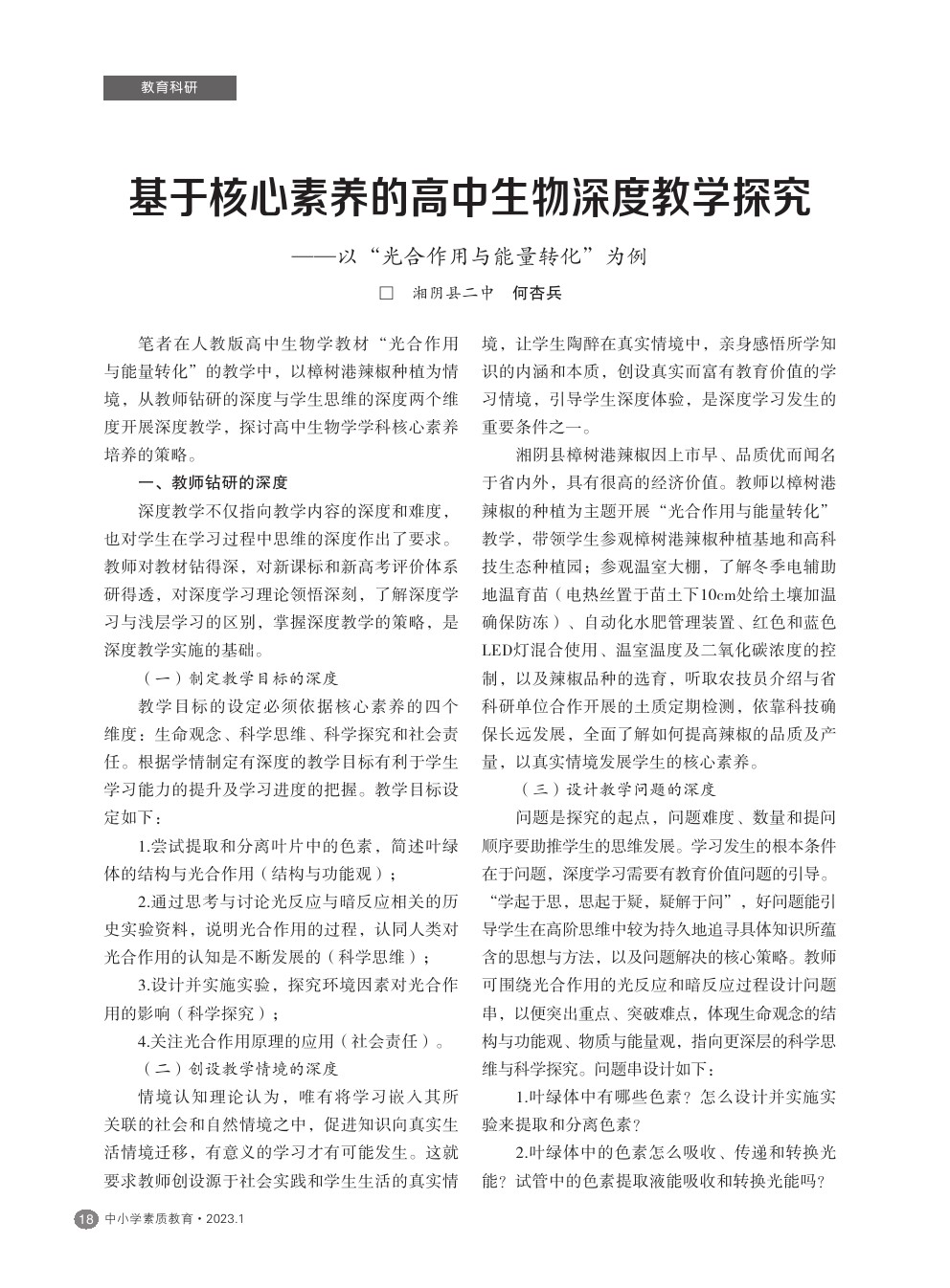 【2023年第1期】基于核心素养的高中生物深度教学探究