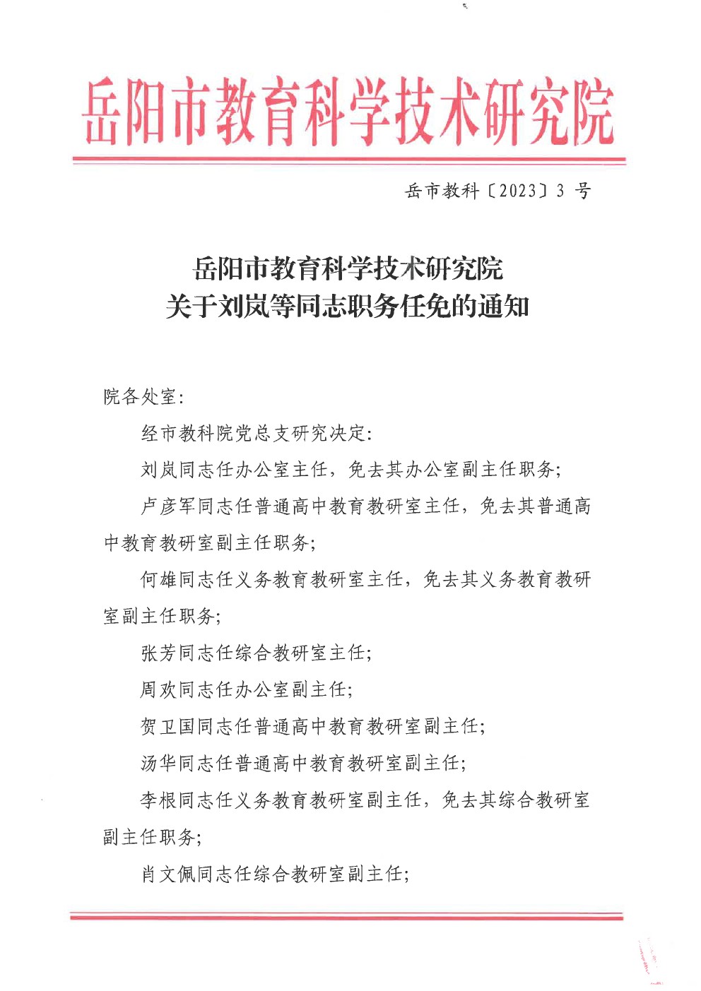 关于刘岚等同志职务任免的通知(岳市教科〔2023〕3 号)