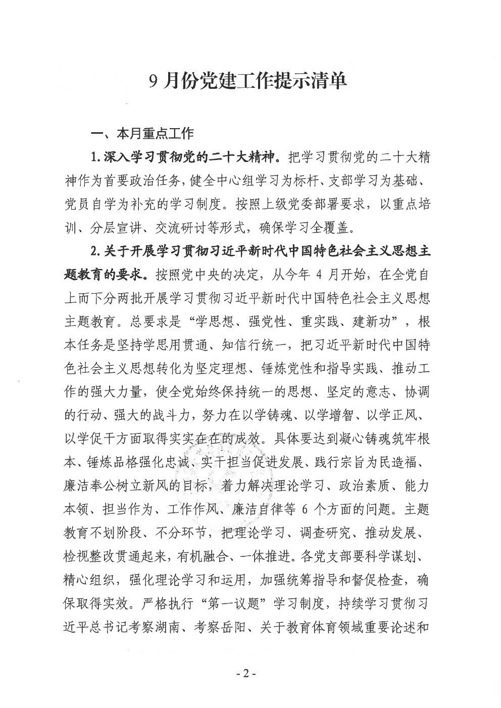 关于印发《2023年9月份支部党建工作提示清单》的通知