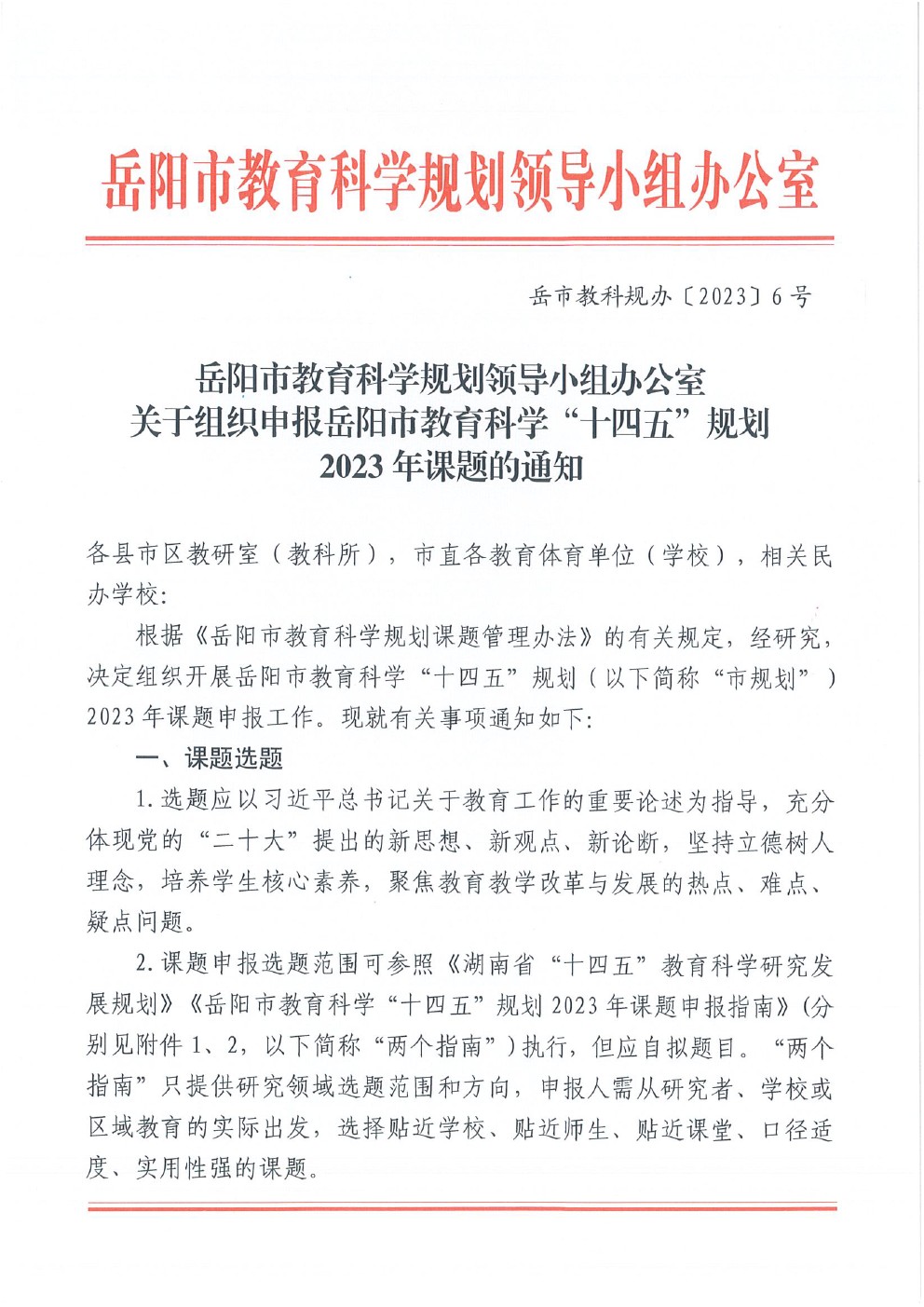 关于组织申报岳阳市教育科学“十四五”规划2023年课题的通知(岳市教科规办〔2023〕6号)