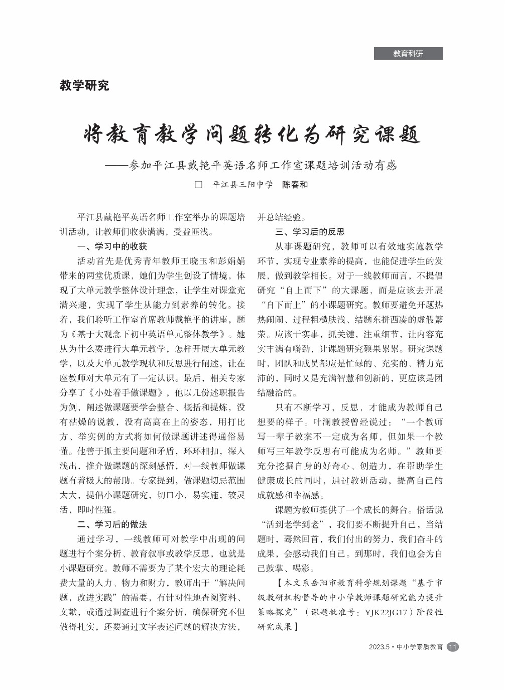 【2023年第5期】将教育教学问题转化为研究课题——参加平江县戴艳平英语名师工作室课题培训活动有感