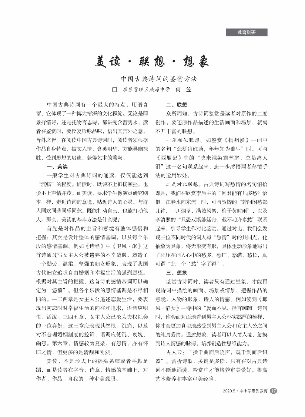 【2023年第5期】美读·联想·想象——中国古典诗词的鉴赏方法
