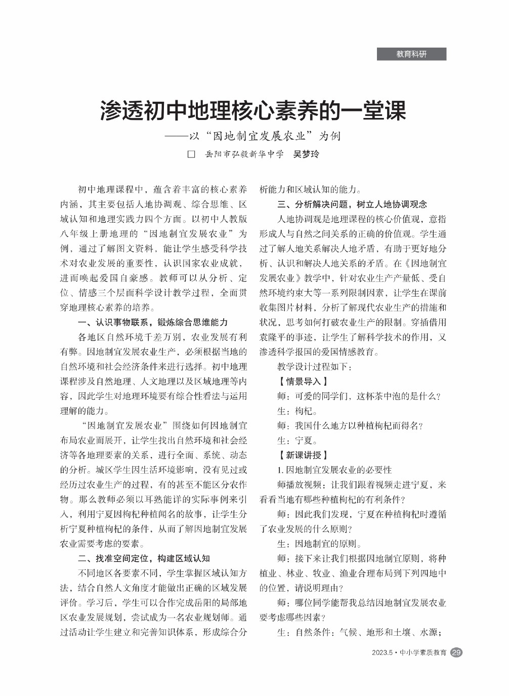 【2023年第5期】渗透初中地理核心素养的一堂课——以“因地制宜发展农业”为例