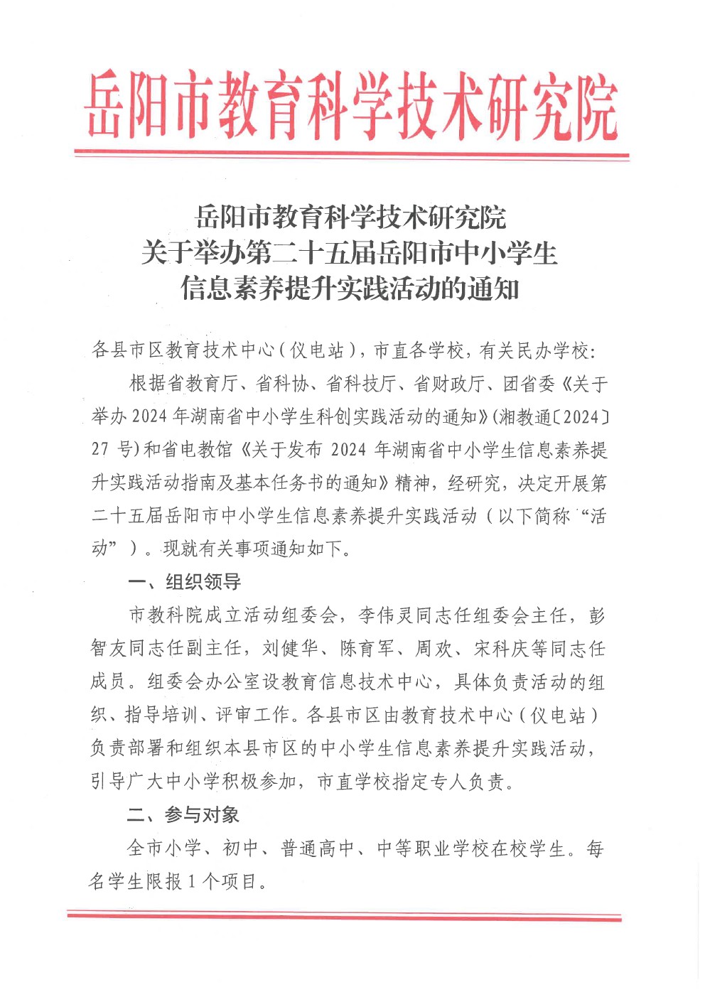 关于举办第二十五届岳阳市中小学生信息素养提升实践活动的通知