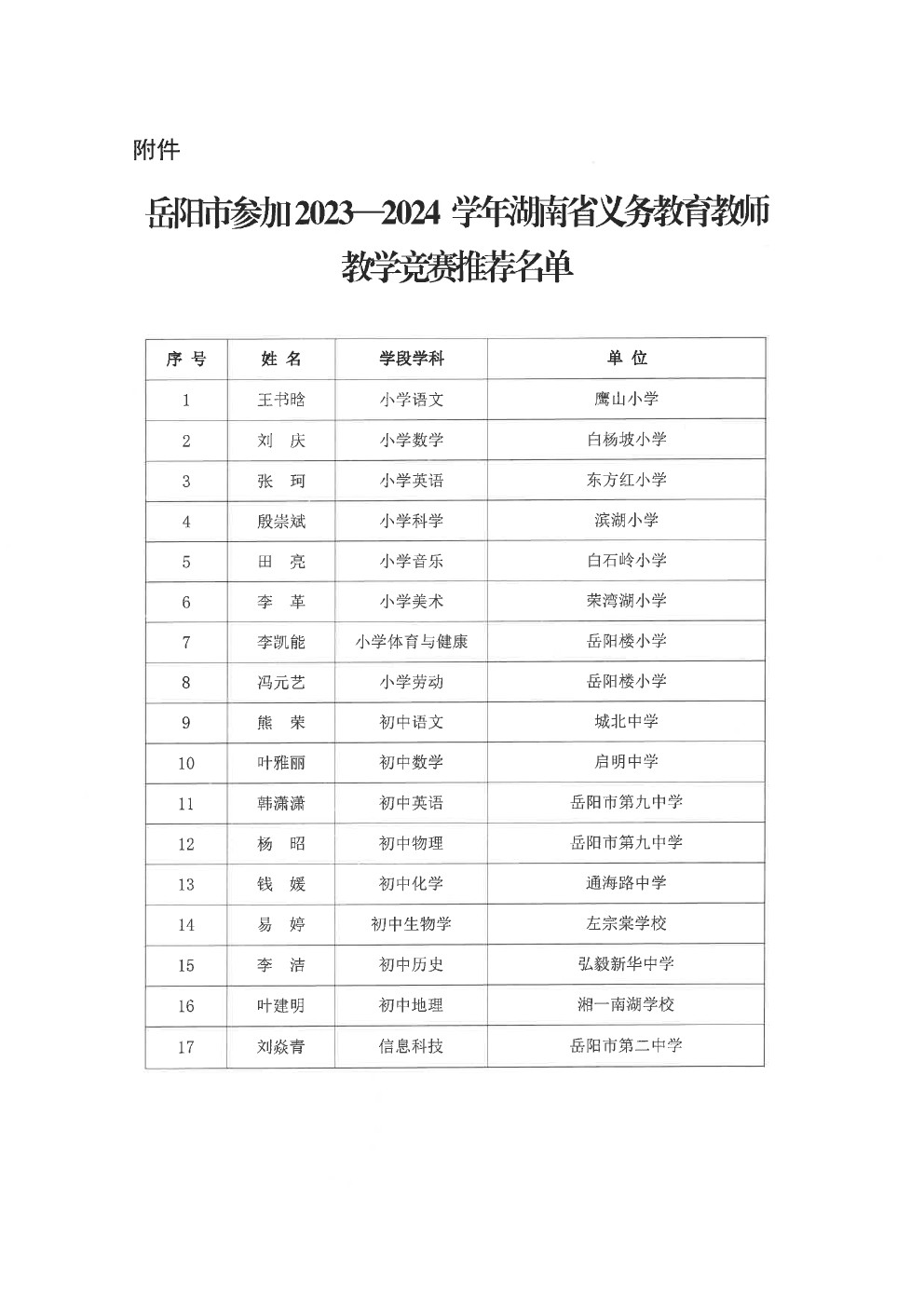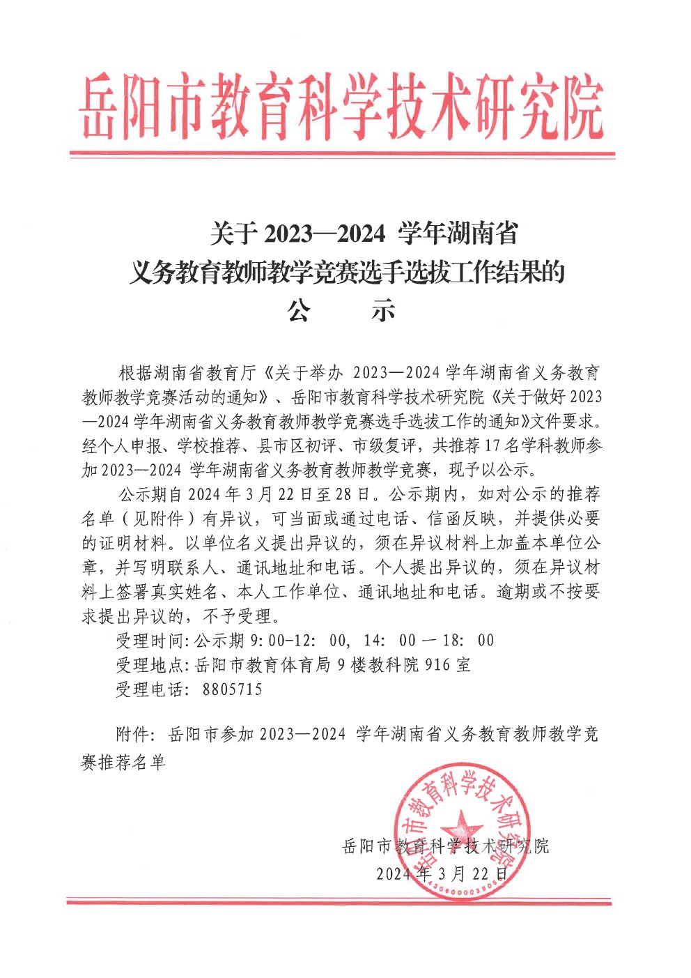 关于2023-2024学年湖南省义务教育教师教学竞赛选手选拔工作结果的公示
