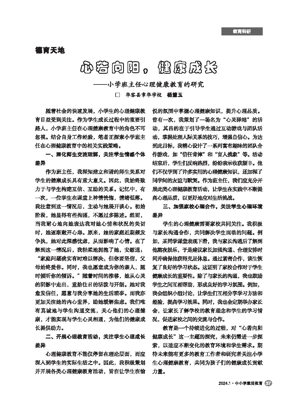 【2024年第1期】心若向阳,健康成长——小学班主任心理健康教育的研究