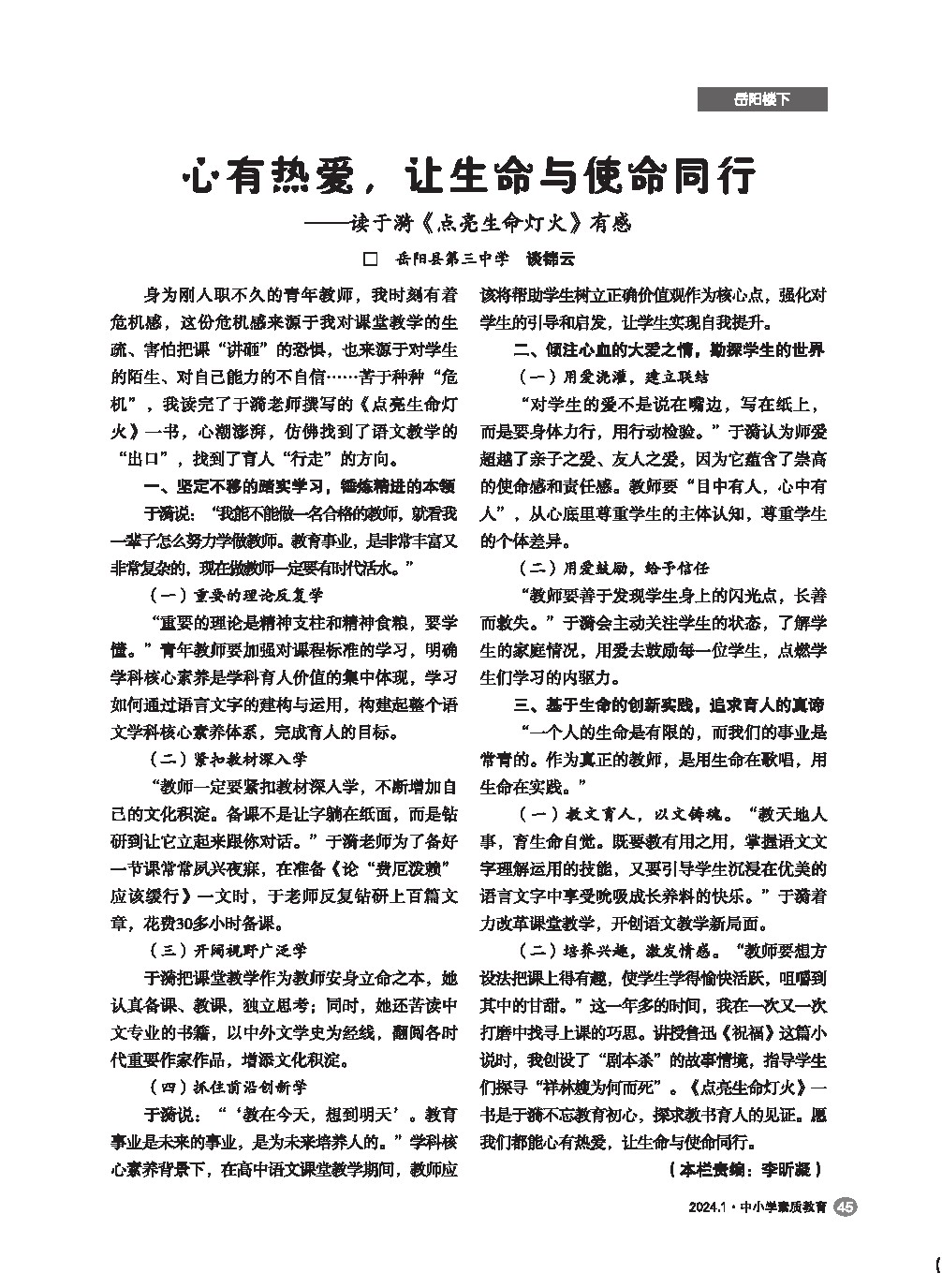 【2024年第1期】心有热爱,让生命与使命同行——读于漪《点亮生命灯火》有感
