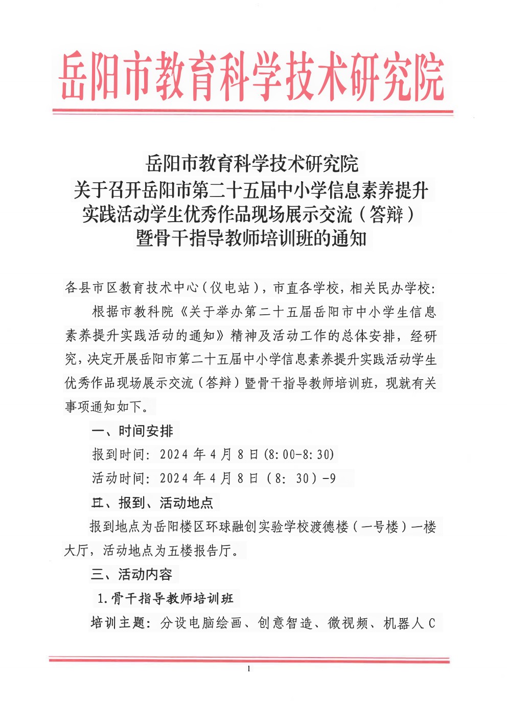 关于召开岳阳市第二十五届中小学信息素养提升实践活动学生优秀作品现场展示交流(答辩)暨骨干指导教师培训班的通知