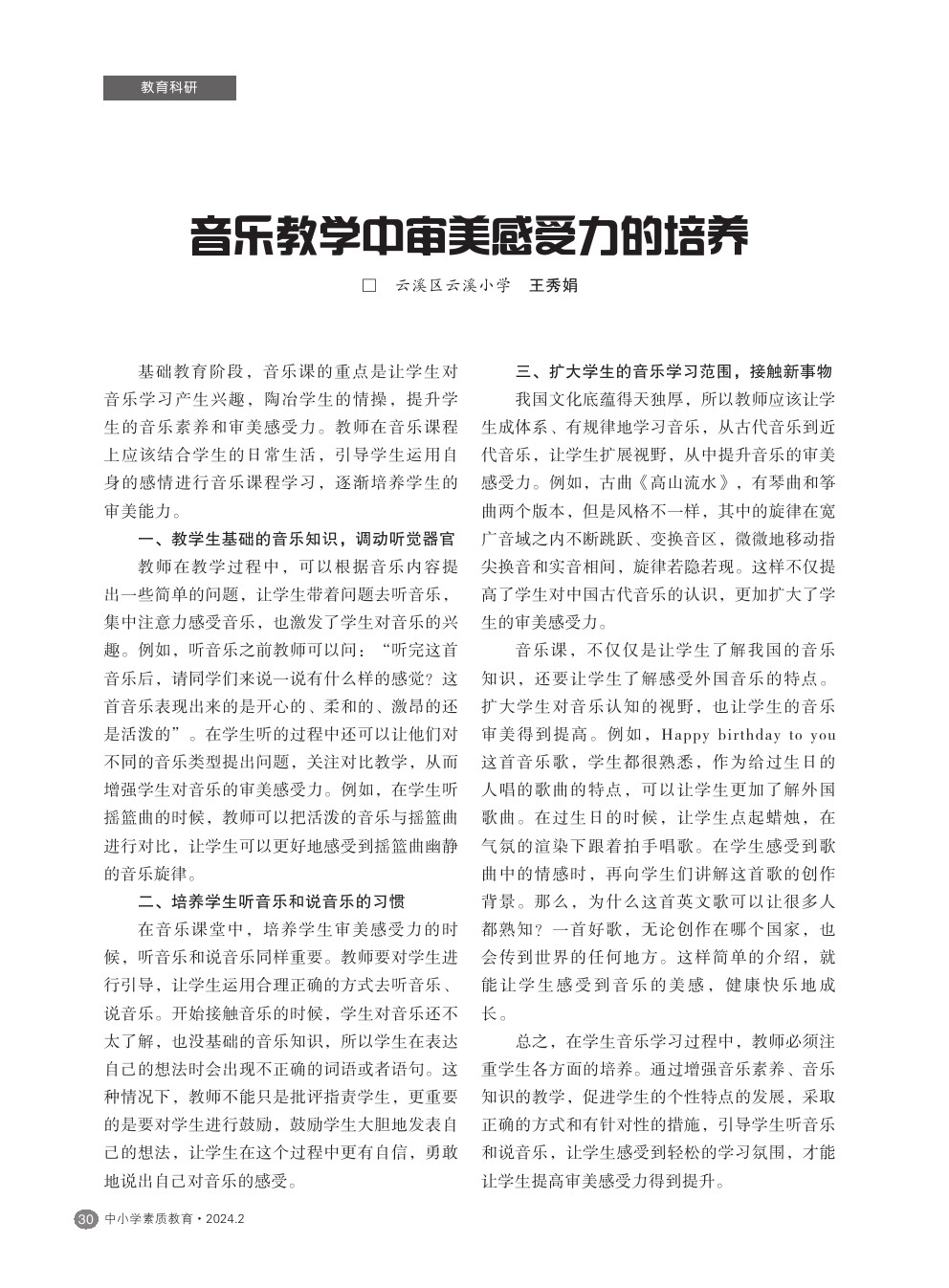 【2024年第2期】音乐教学中审美感受力的培养