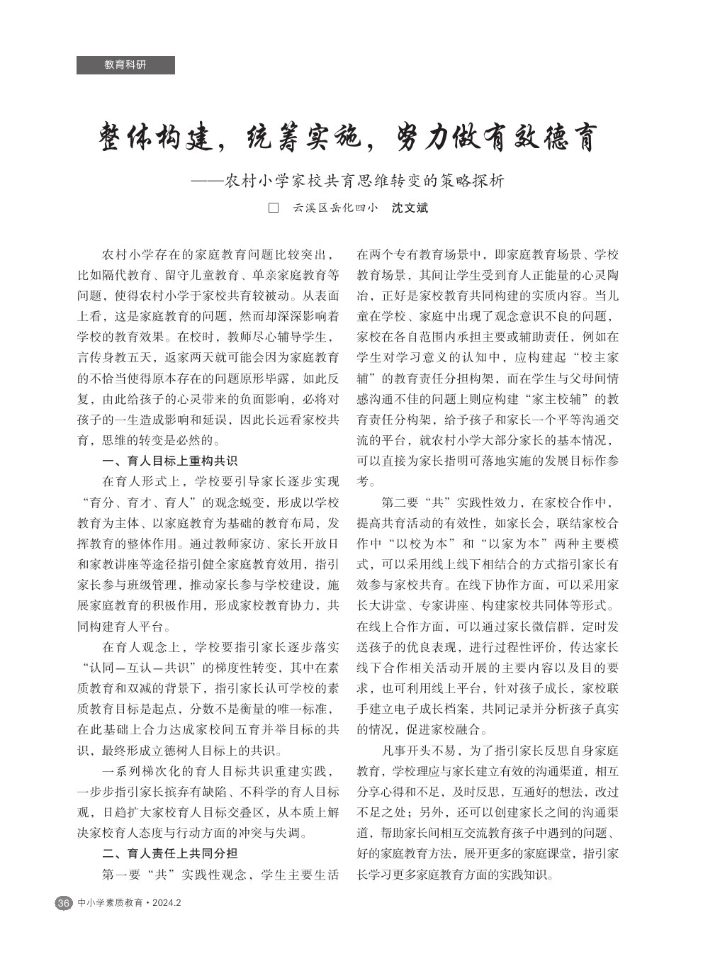【2024年第2期】整体构建,统筹实施,努力做有效德育——农村小学家校共育思维转变的策略探析