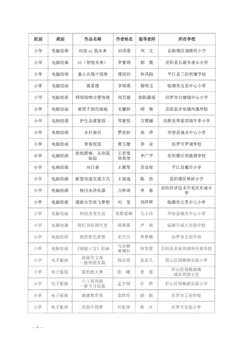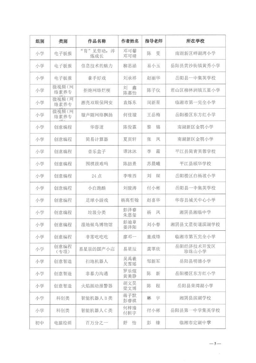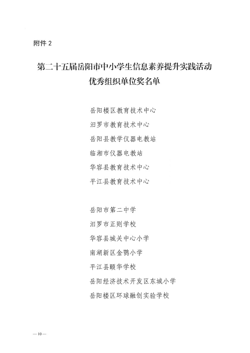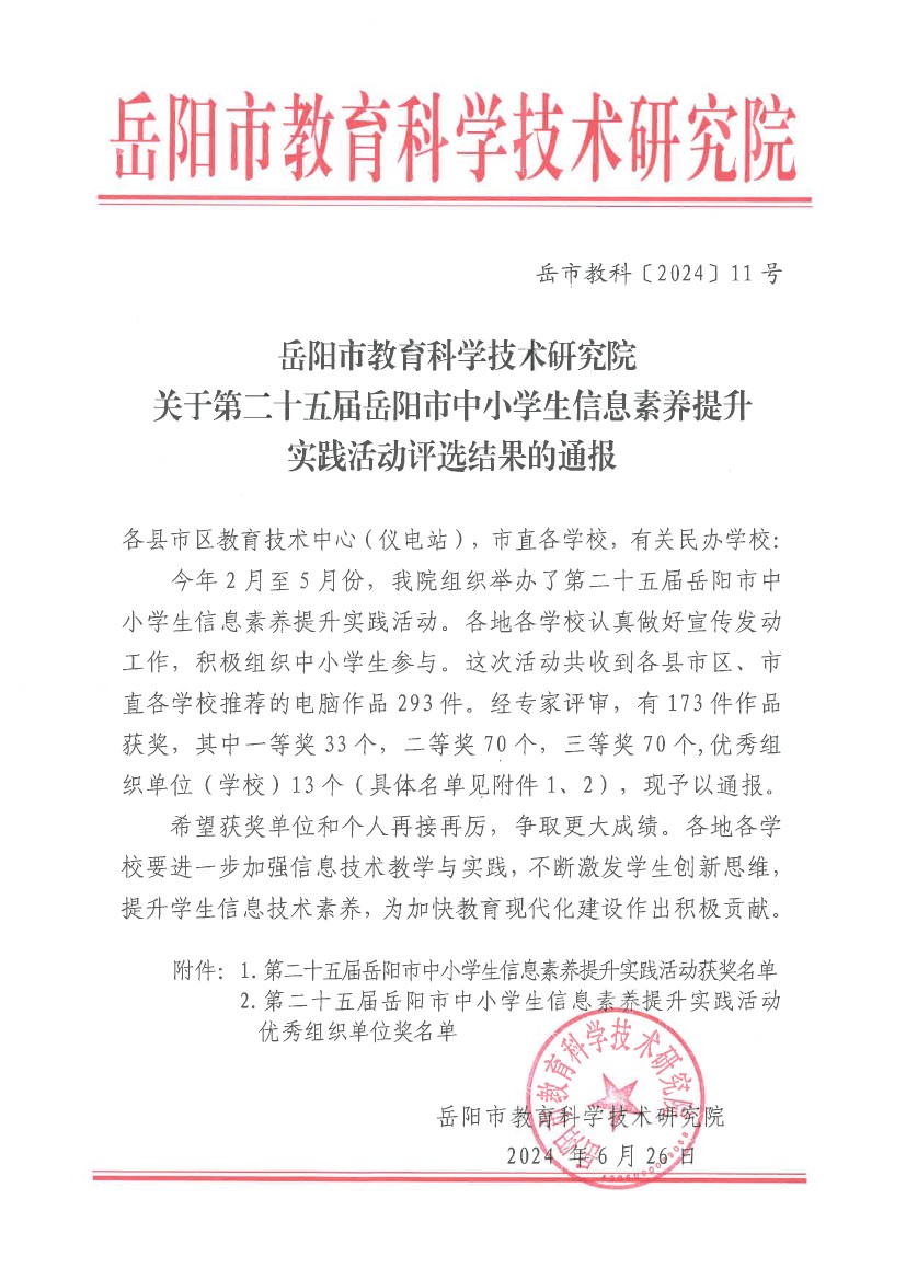 关于第二十五届岳阳市中小学生信息素养提升实践活动评选结果的通报(岳市教科〔2024〕11号)