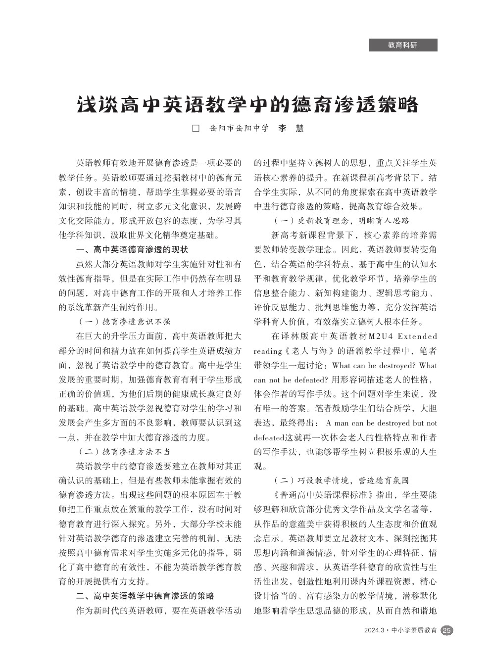 【2024年第3期】浅谈高中英语教学中的德育渗透策略