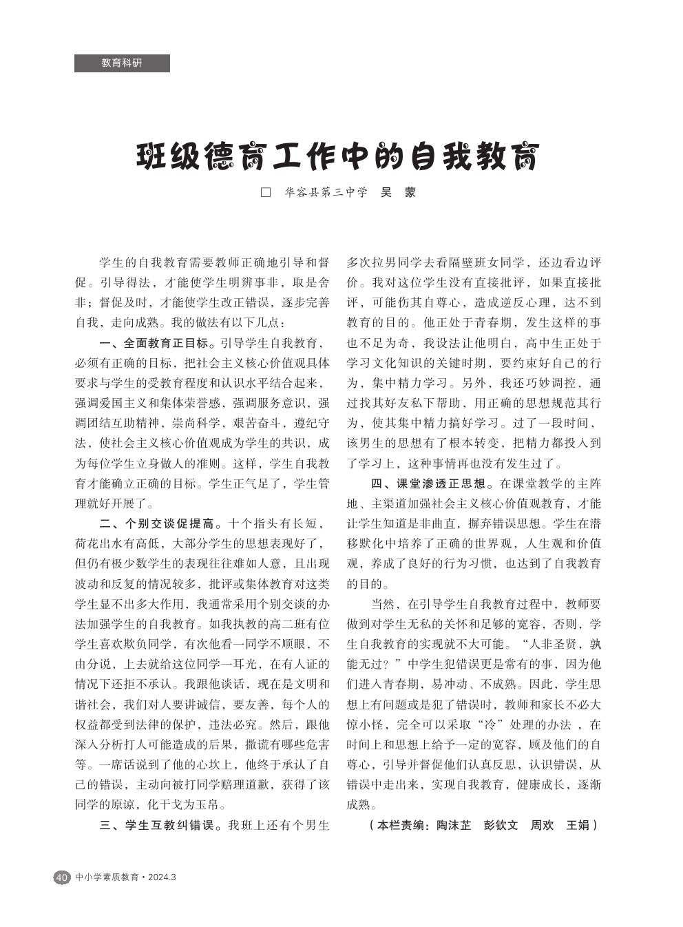 【2024年第3期】班级德育工作中的自我教育