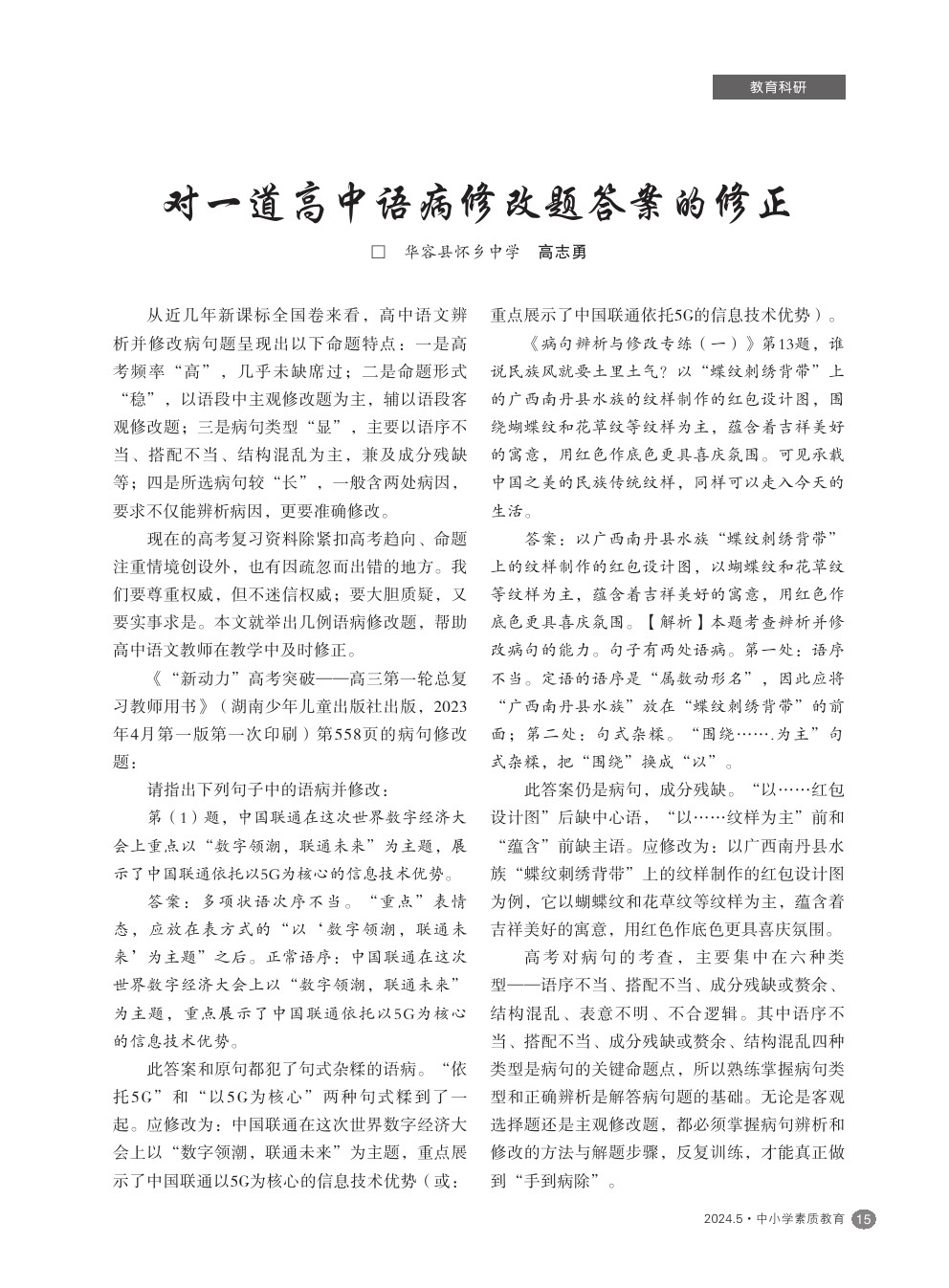 【2024年第5期】对一道高中语病修改题答案的修正