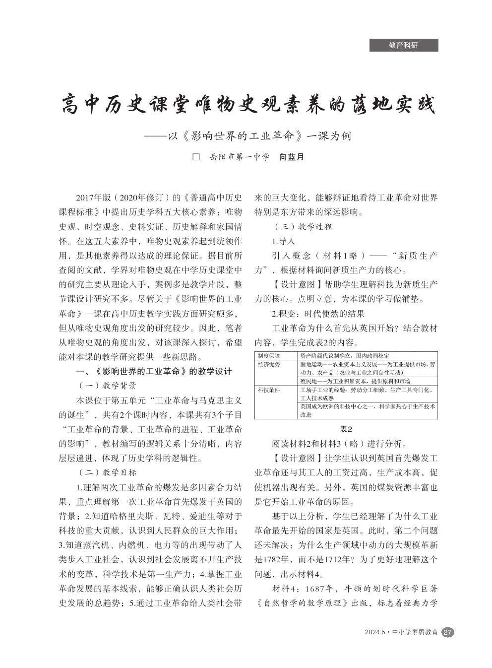 【2024年第5期】高中历史课堂唯物史观素养的落地实践——以《影响世界的工业革命》一课为例