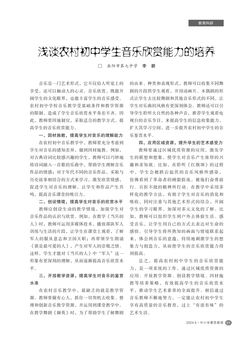 【2024年第5期】浅谈农村初中学生音乐欣赏能力的培养