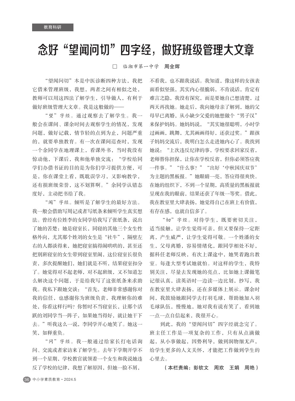 【2024年第5期】念好“望闻问切”四字经,做好班级管理大文章
