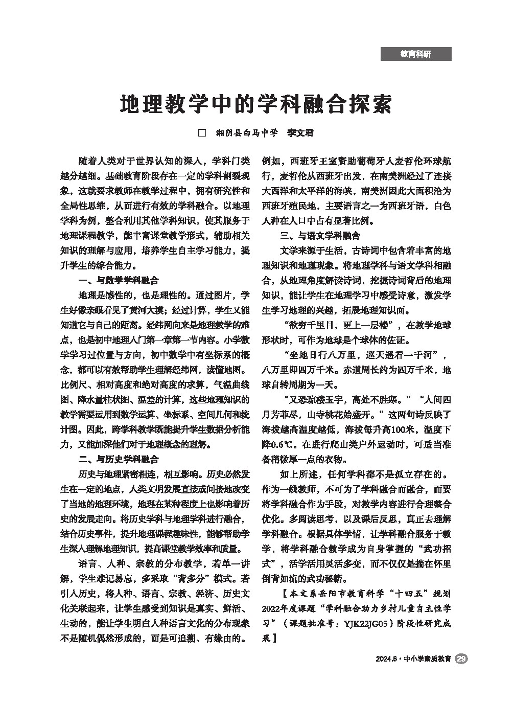 【2024年第6期】地理教学中的学科融合探索