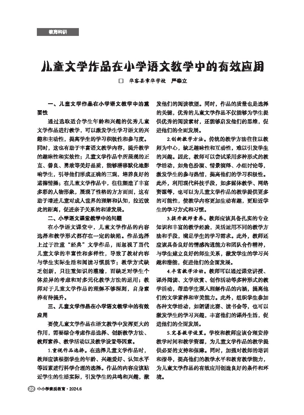 【2024年第6期】儿童文学作品在小学语文教学中的有效应用