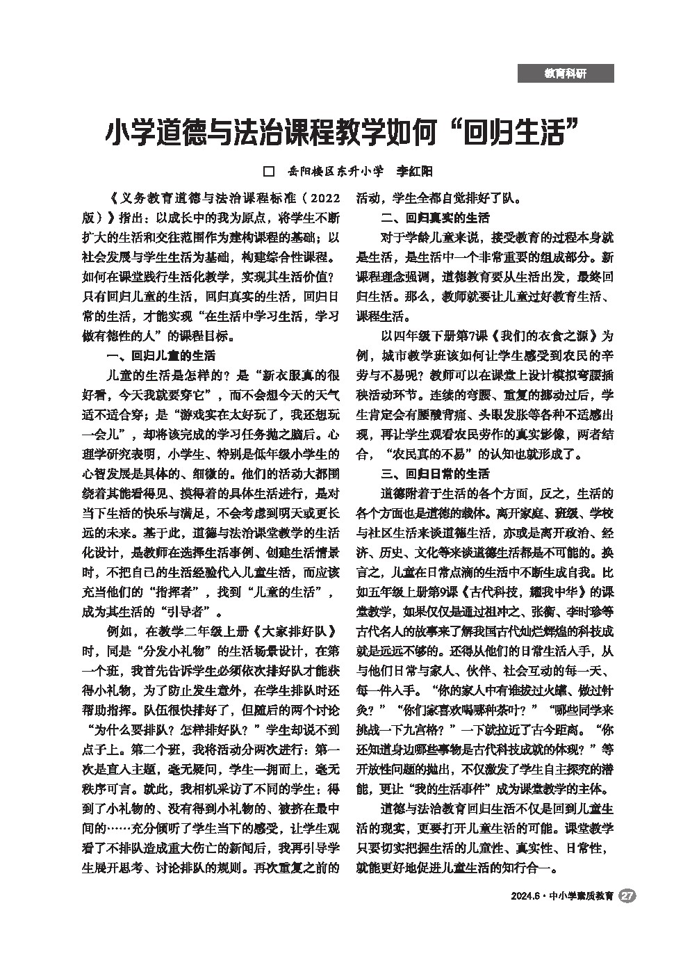 【2024年第6期】小学道德与法治课程教学如何“回归生活”
