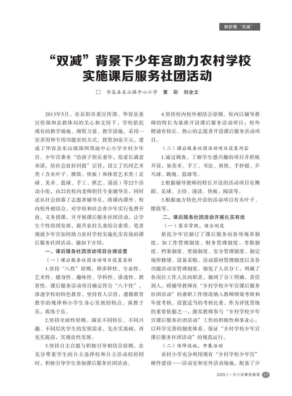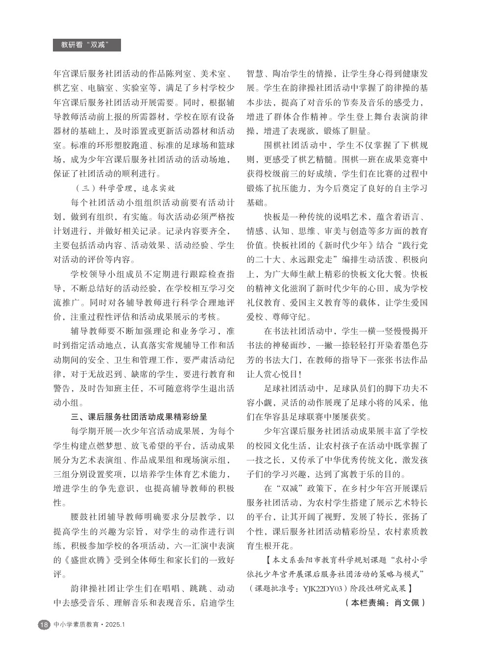 【2025年第1期】“双减”背景下少年宫助力农村学校实施课后服务社团活动