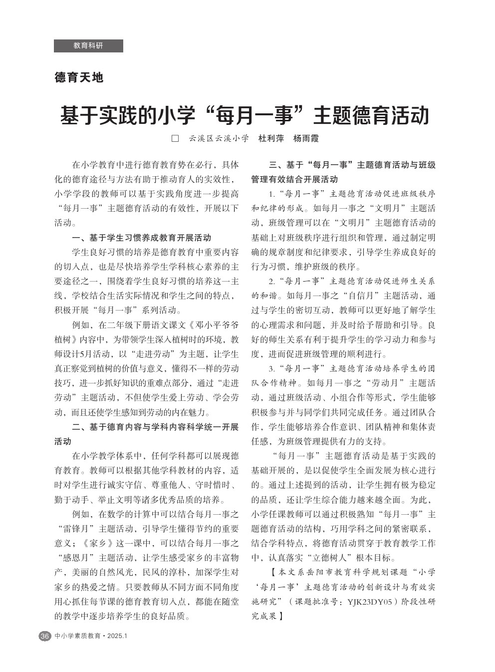 【2025年第1期】基于实践的小学“每月一事”主题德育活动