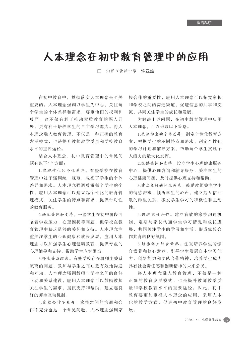 【2025年第1期】人本理念在初中教育管理中的应用