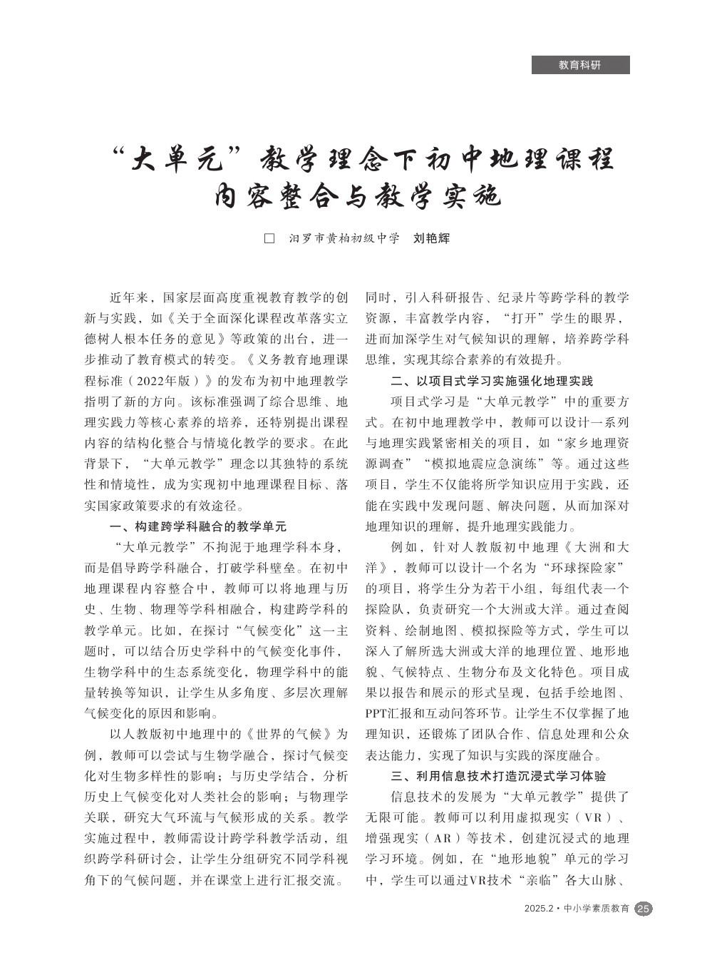 【2025年第2期】“大单元”教学理念下初中地理课程内容整合与教学实施