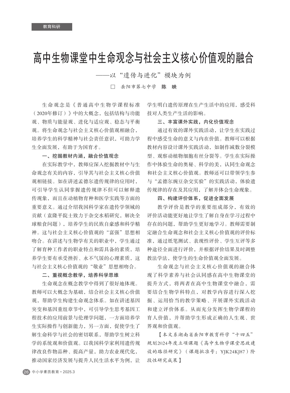 【2025年第3期】高中生物课堂中生命观念与社会主义核心价值观的融合——以“遗传与进化”模块为例