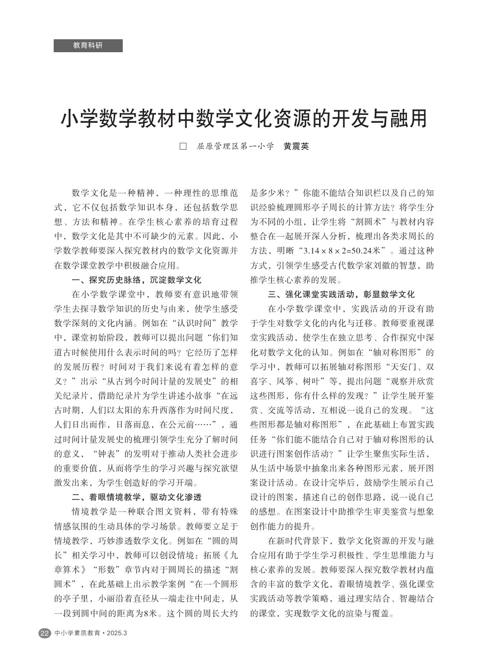 【2025年第3期】小学数学教材中数学文化资源的开发与融用