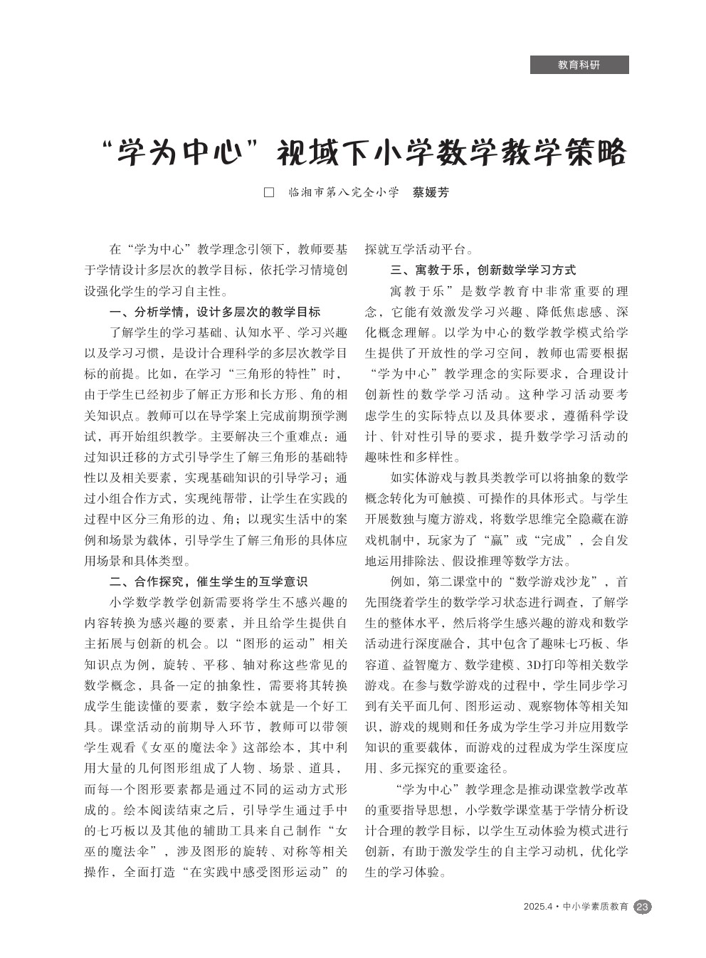 【2025年第4期】“学为中心”视域下小学数学教学策略