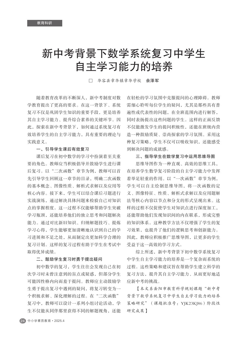 【2025年第4期】新中考背景下数学系统复习中学生自主学习能力的培养