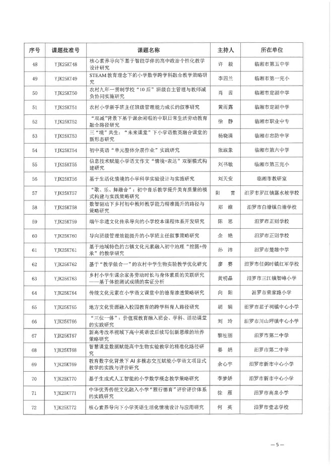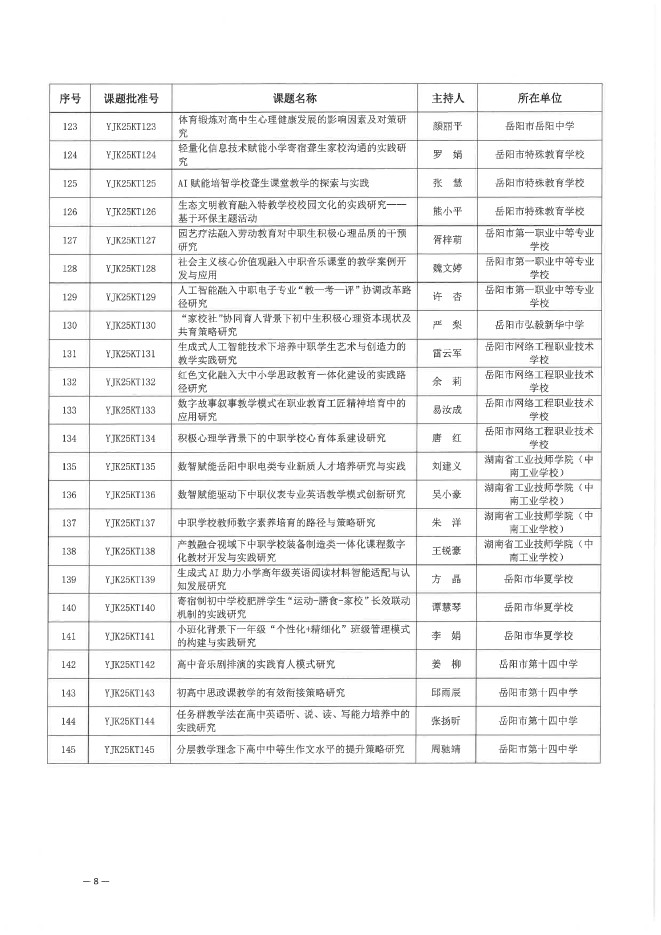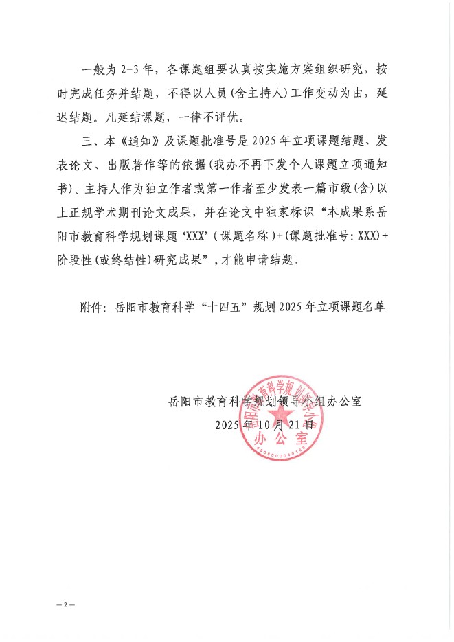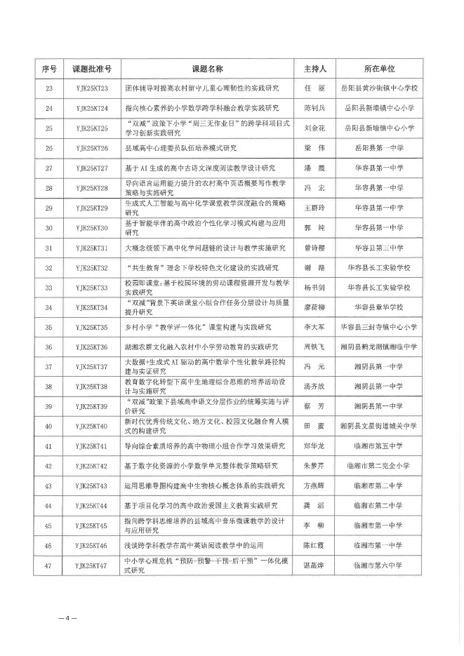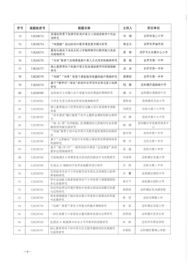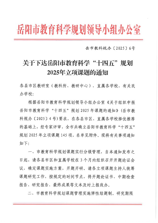 关于下达岳阳市教育科学“十四五”规划 2025年立项课题的通知(岳市教科规办〔2025〕6号)