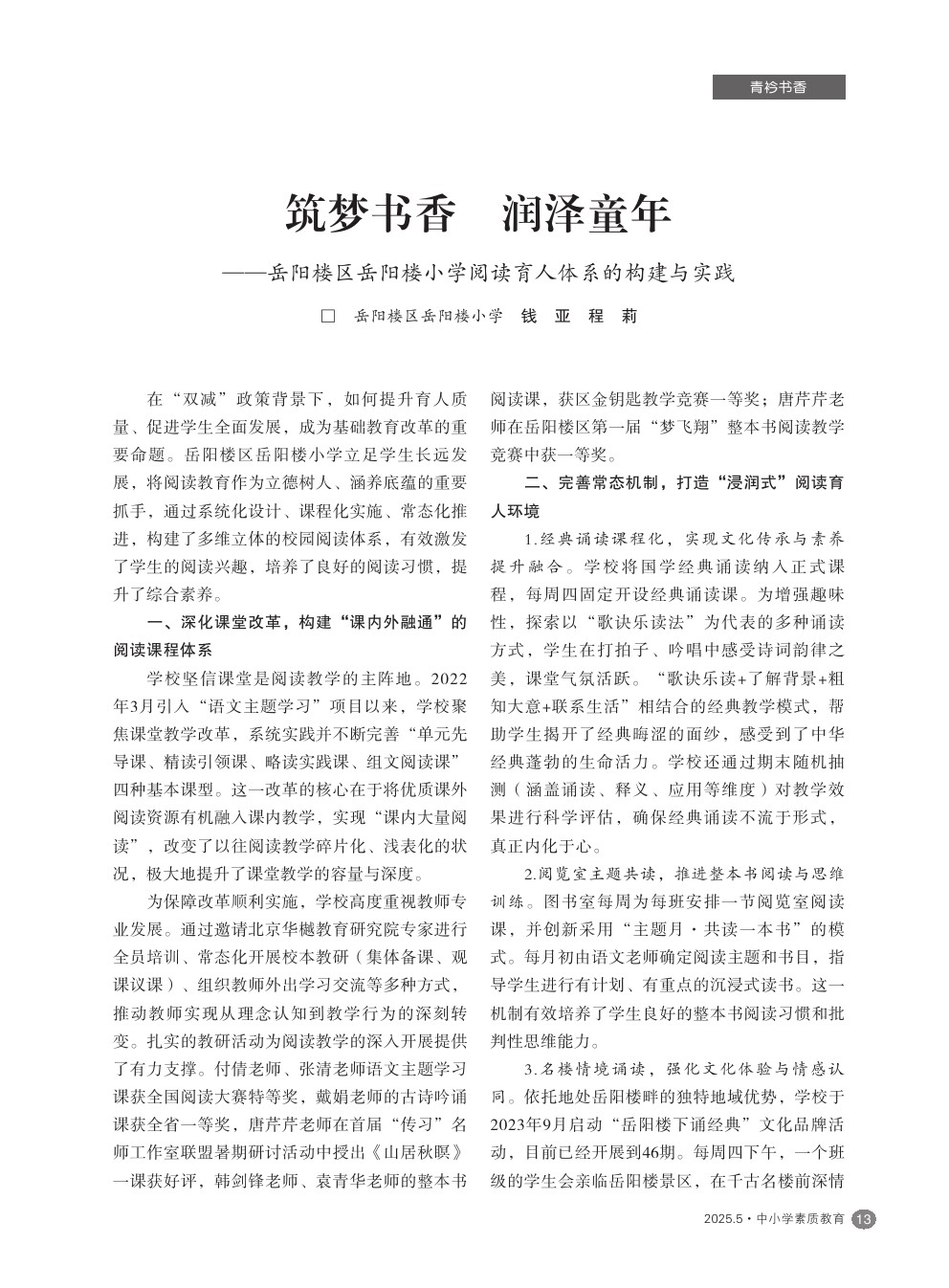 【2025年第5期】筑梦书香 润泽童年——岳阳楼区岳阳楼小学阅读育人体系的构建与实践