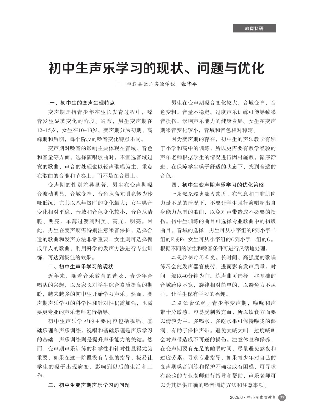 【2025年第6期】初中生声乐学习的现状、问题与优化