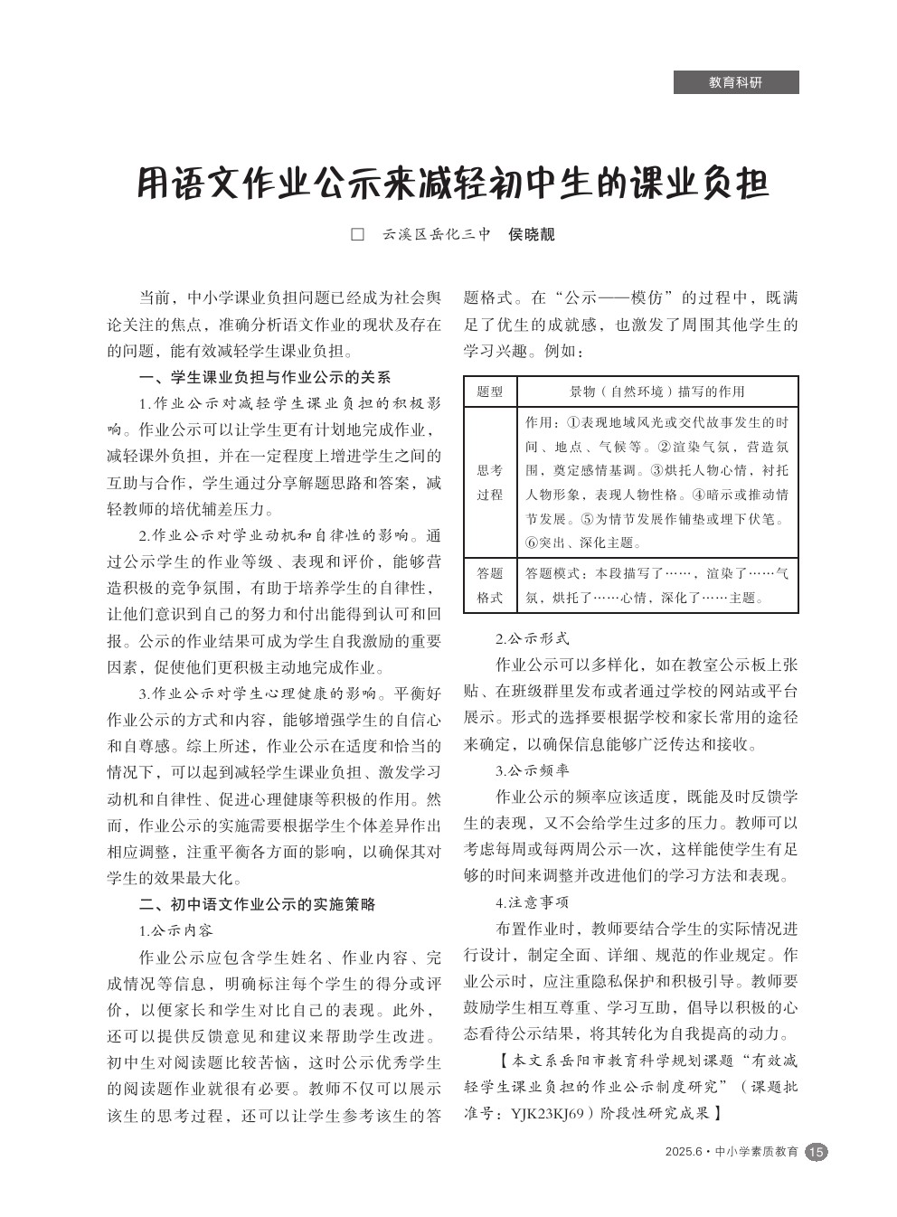 【2025年第6期】用语文作业公示来减轻初中生的课业负担