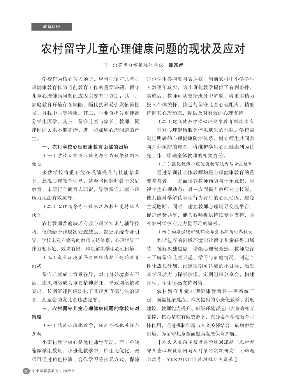 【2025年第6期】农村留守儿童心理健康问题的现状及应对