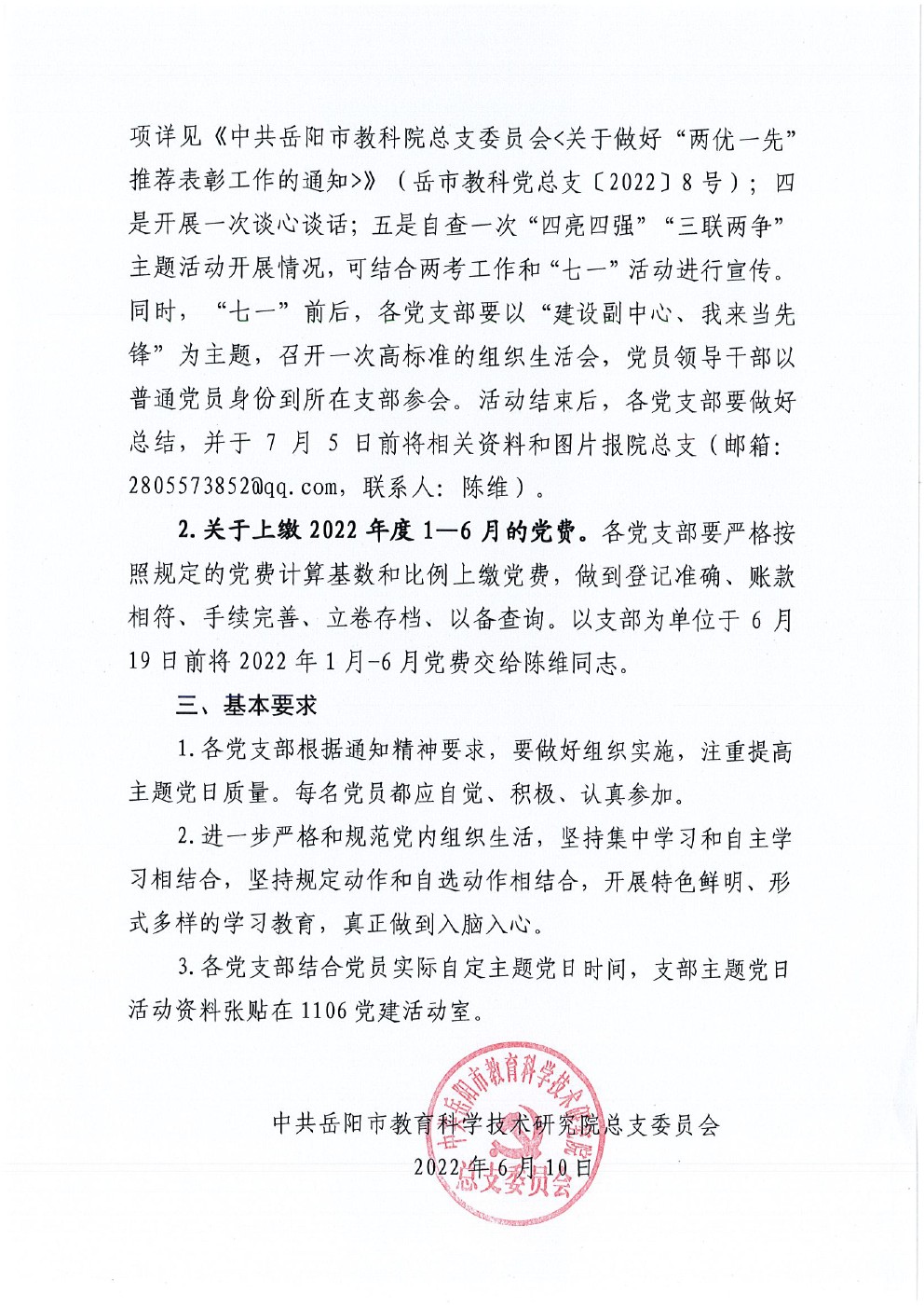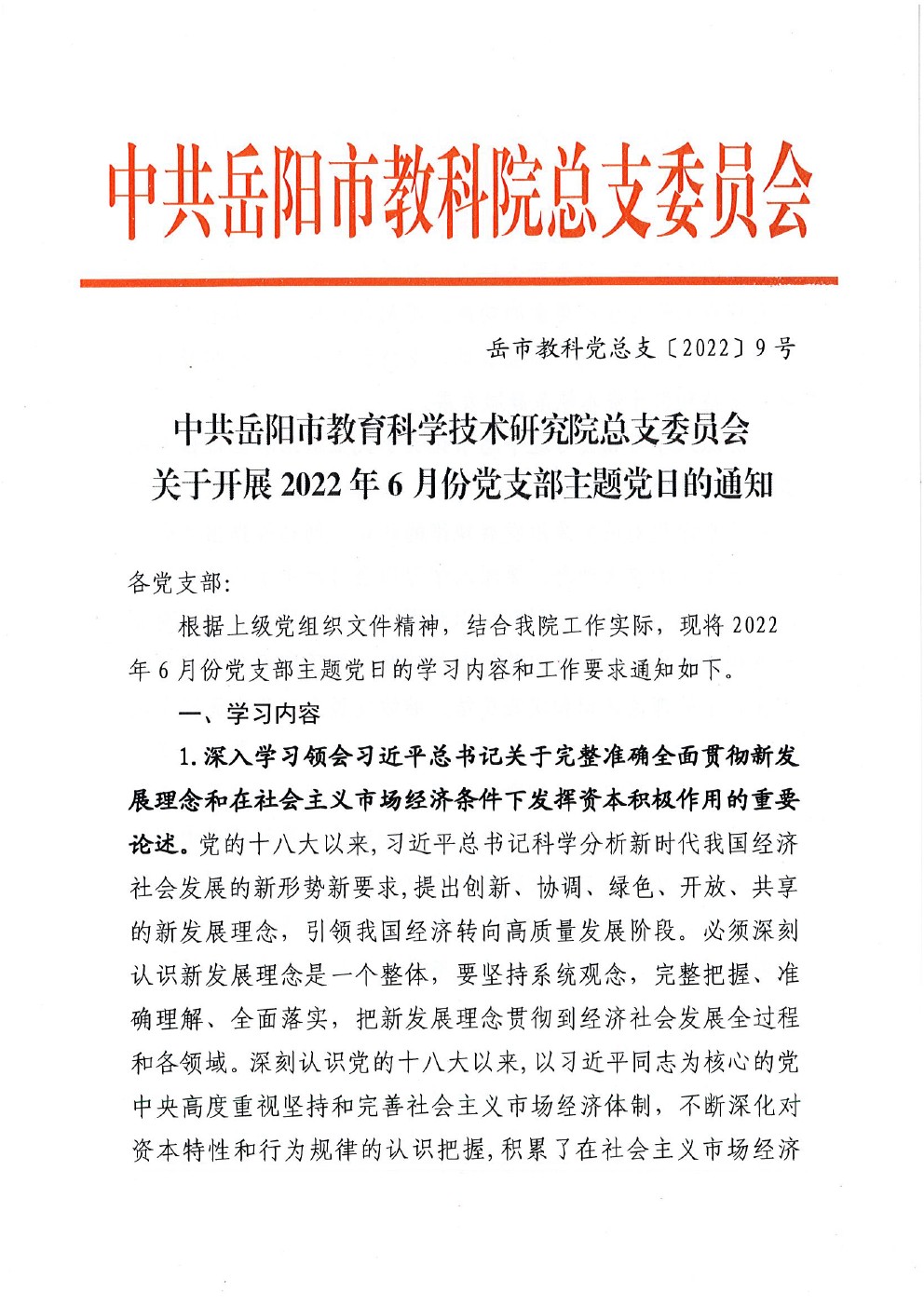 关于开展2022年6月份党支部主题党日的通知(岳市教科党总支〔2022〕9号)